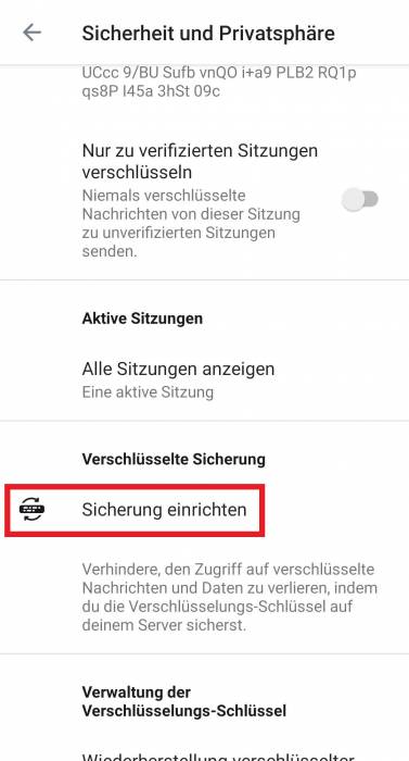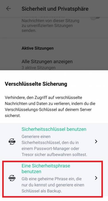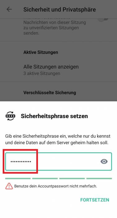 Zusätzlich kann eine Sicherheitsphrase festgelegt werden. Dabei werden die Sicherheitschlüssel auf den Servern der TUC gespeichert und können auf jedem Gerät über die Eingabe der Phrase abgerufen werden.