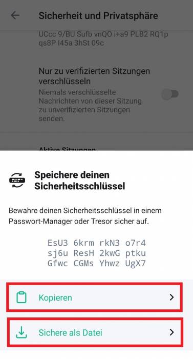 Zusätzlich kann eine Sicherheitsphrase festgelegt werden. Dabei werden die Sicherheitschlüssel auf den Servern der TUC gespeichert und können auf jedem Gerät über die Eingabe der Phrase abgerufen werden.