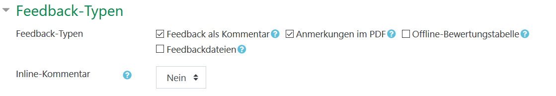Unter „Feedback-Typen“ wird festgelegt, in welcher Form den Studierenden ein Feedback gegeben werden kann. Wenn die Lösung von den Studierenden per PDF eingereicht wurde, gibt es bei der Bewertung die Möglichkeit, die Kommentare direkt in das Dokument zu schreiben und dem Studierenden wieder zur Verfügung zu stellen. Dazu wählen Sie bitte die Option „Anmerkungen im PDF“.