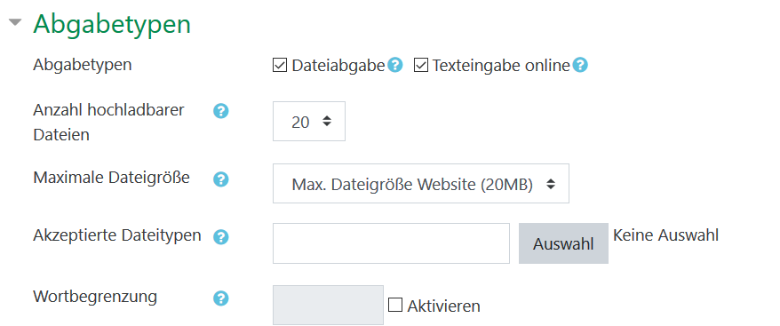 Im Bereich „Abgabetypen“ können Sie entscheiden, welche Dateitypen verwendet werden dürfen. Wenn Studierende Word-/PDF-Dateien oder Bilder hochladen können sollen, lassen Sie das Häkchen vor „Dateiabgabe“ gesetzt: