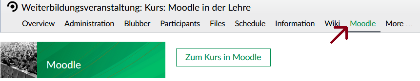 The tab “Moodle” will be displayed at the top in Stud.IP-courses using Moodle. If you visit this page, you can use the button „Zum Kurs in Moodle“ (i.e. “Access Moodle-course”).
