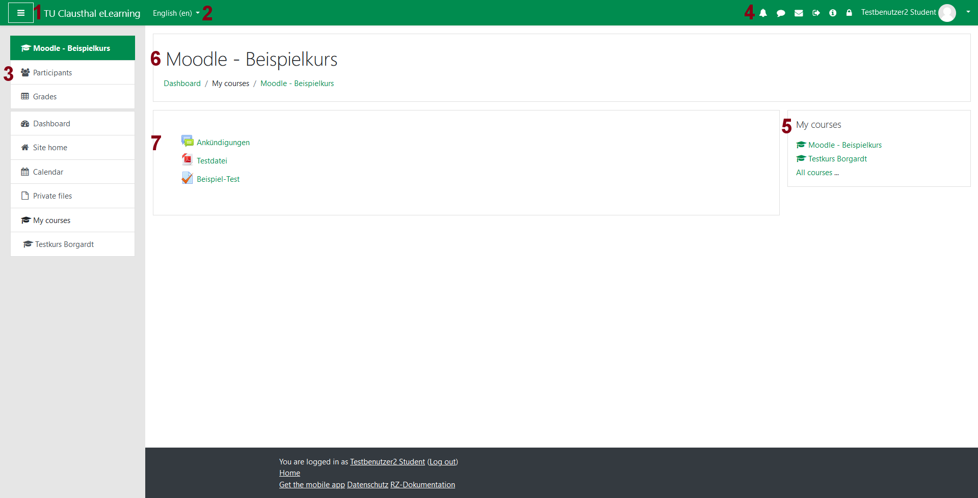 “My courses” on the right side gives you an overview about the Moodle-courses you are enrolled in and lets you navigate there easily (5).