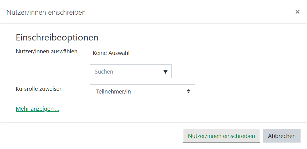 Die „Kursrolle“ Teilnehmer/in können Sie beibehalten und „Nutzer/in einschreiben“ drücken.