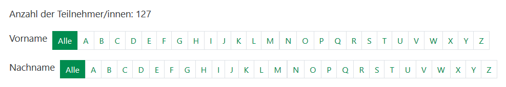 Bei sehr langen Teilnehmerlisten kann die Moodle-Funktion, nach Anfangsbuchstaben der Vor- und Nachnamen zu filtern, hilfreich sein: