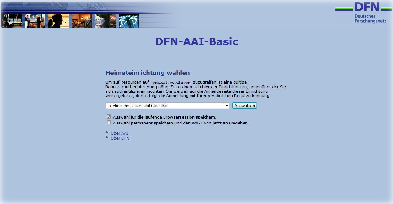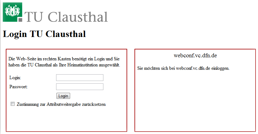 Durch den Dienst DFN-AAI müssen Mitarbeiter der TU Clausthal für den Zugang zum DFN-Webkonferenzdienst keinen Account beantragen, sondern können sich mit ihrer TUC Benutzerkennung an dem System anmelden. Studierende können sich über DFN-AAI nicht anmelden. Sie können nur als Gast an Webkonferenzen teilnehmen.