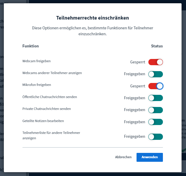 Bitte schränken Sie die Rechte Ihrer BBB-Teilnehmer entsprechend ein, sodass keine Audio-Wortmeldungen möglich sind.