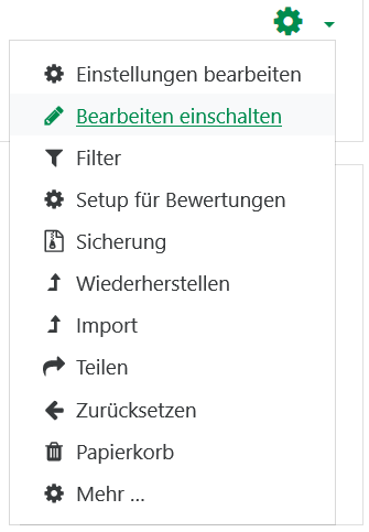 In dieser Anleitung soll aufgezeigt werden, wie eine „BigBlueButton“ Aktivität in einem Moodle Kurs erstellt werden kann. Um dies tun zu können, muss man sich zunächst in dem entsprechenden Kurs im Bearbeitungsmodus befinden. Diesen kann man oben rechts mit einem Klick auf das Zahnrad einschalten: