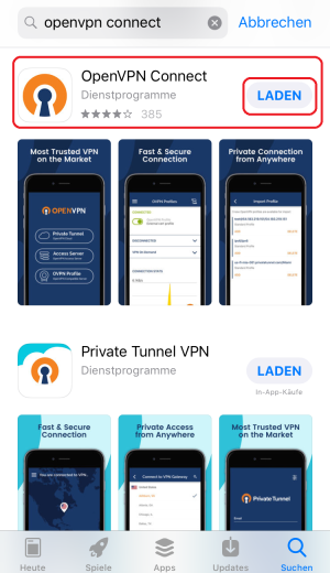 - Suchen Sie über die Suchfunktion des App Store nach OpenVPN Connect und wählen Sie ersten Punkt aus.