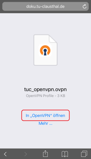- Laden Sie sich eine OpenVPN-Konfigurationsdatei herunter, indem Sie den Download-Link auf Ihrem iOS-Gerät (iPhone/iPad) mit dem Web-Browser anklicken. Der Web-Browser bietet Ihnen dann an, die Konfigurationsdatei im OpenVPN-Client zu öffnen und sie zu importieren. Wählen Sie hierzu In „OpenVPN“ öffnen aus.