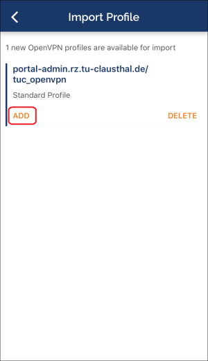 - Geben Sie dem OpenVPN-Profil einen Namen (z.B. TUC VPN), geben Sie unter Username Ihren TUC-User ein und drücken Sie auf ADD.