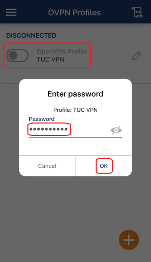 - Betätigen Sie den Schiebeschalter beim OpenVPN-Profil mit der Bezeichnung TUC VPN, geben Sie Ihr TUC-Passwort ein und bestätigen Sie mit OK.