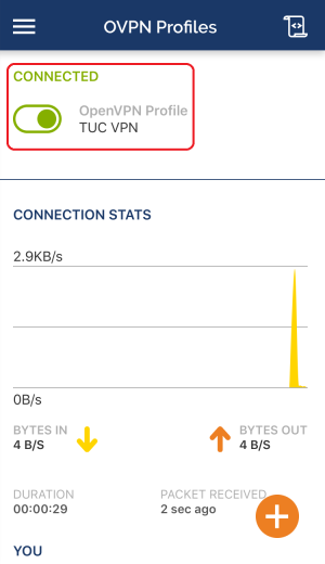 - Wenn der Schiebeschalter nun grün gefärbt ist und dort CONNECTED zu lesen ist, haben Sie erfolgreich eine VPN-Verbindung aufgebaut. Unter CONNECTION STATS sollte nun auch Aktivität zu sehen sein.