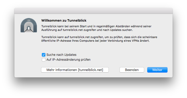 - Starten Sie die Installation von Tunnelblick. Setzen Sie den Haken bei „Suche nach Updates“ und klicken Sie auf „Weiter“.