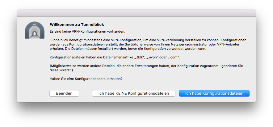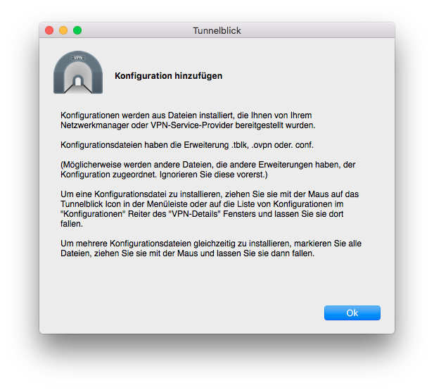 - Zuletzt erscheint noch ein Fenster wie man Konfigurationsdateien installiert, klicken Sie auf Ok. Tunnelblick ist jetzt installiert und erscheint oben in der Taskleiste.