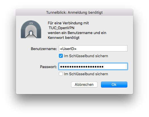 - Die Anmeldung zum VPN erscheint. Dazu benötigen Sie Ihren TUC-User und Ihr TUC-Passwort. Damit sich die VPN Ihre Anmeldedaten merkt, setzten Sie den Haken bei „Im Schlüsselbund sichern“.