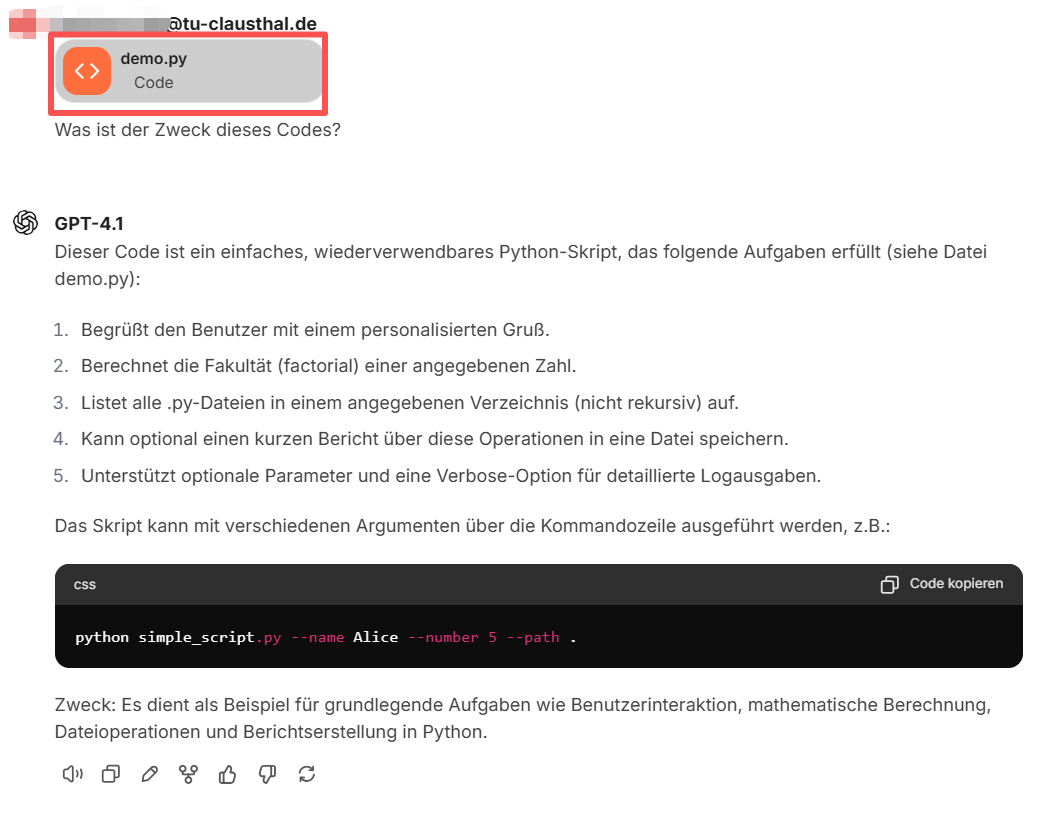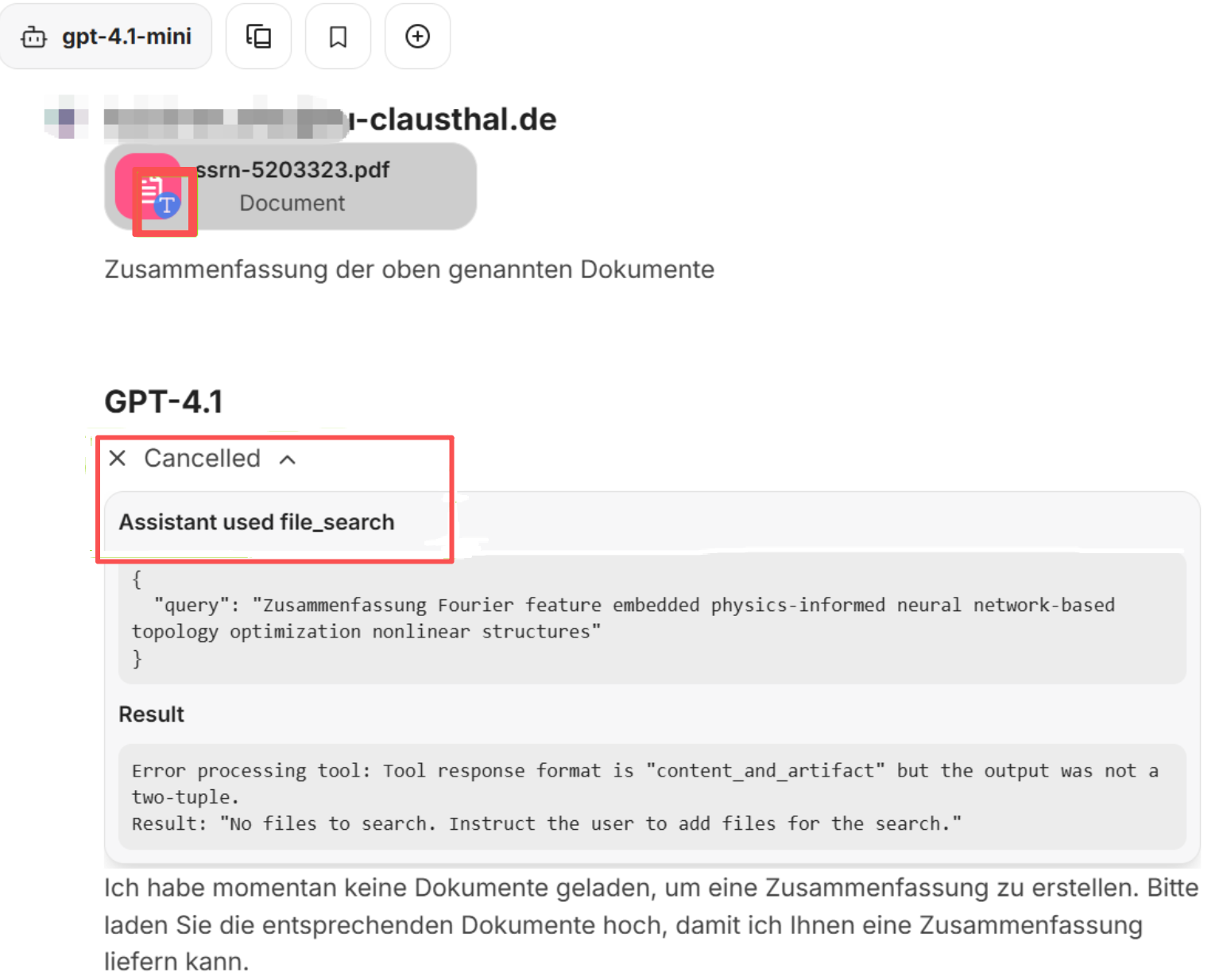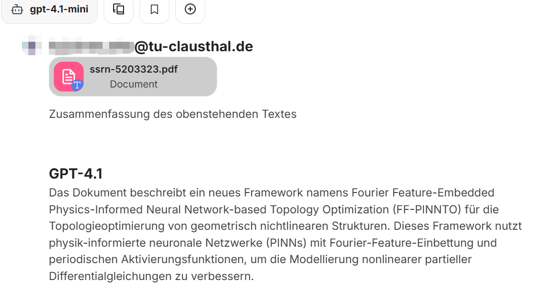 - Beim Hochladen als reiner Text verwendet das Sprachmodell keine zusätzlichen Werkzeuge, wie zum Beispiel das Tool „file search“.