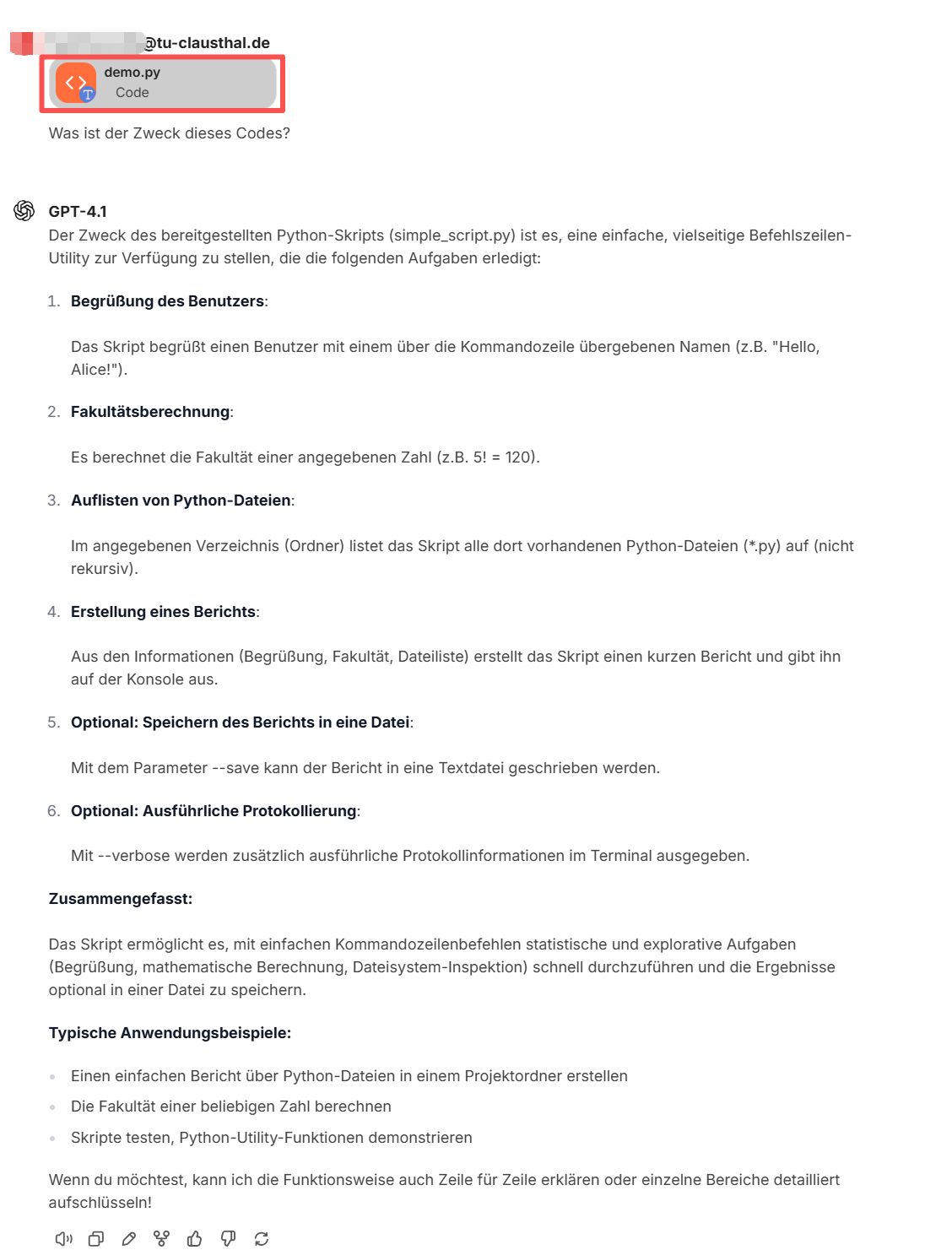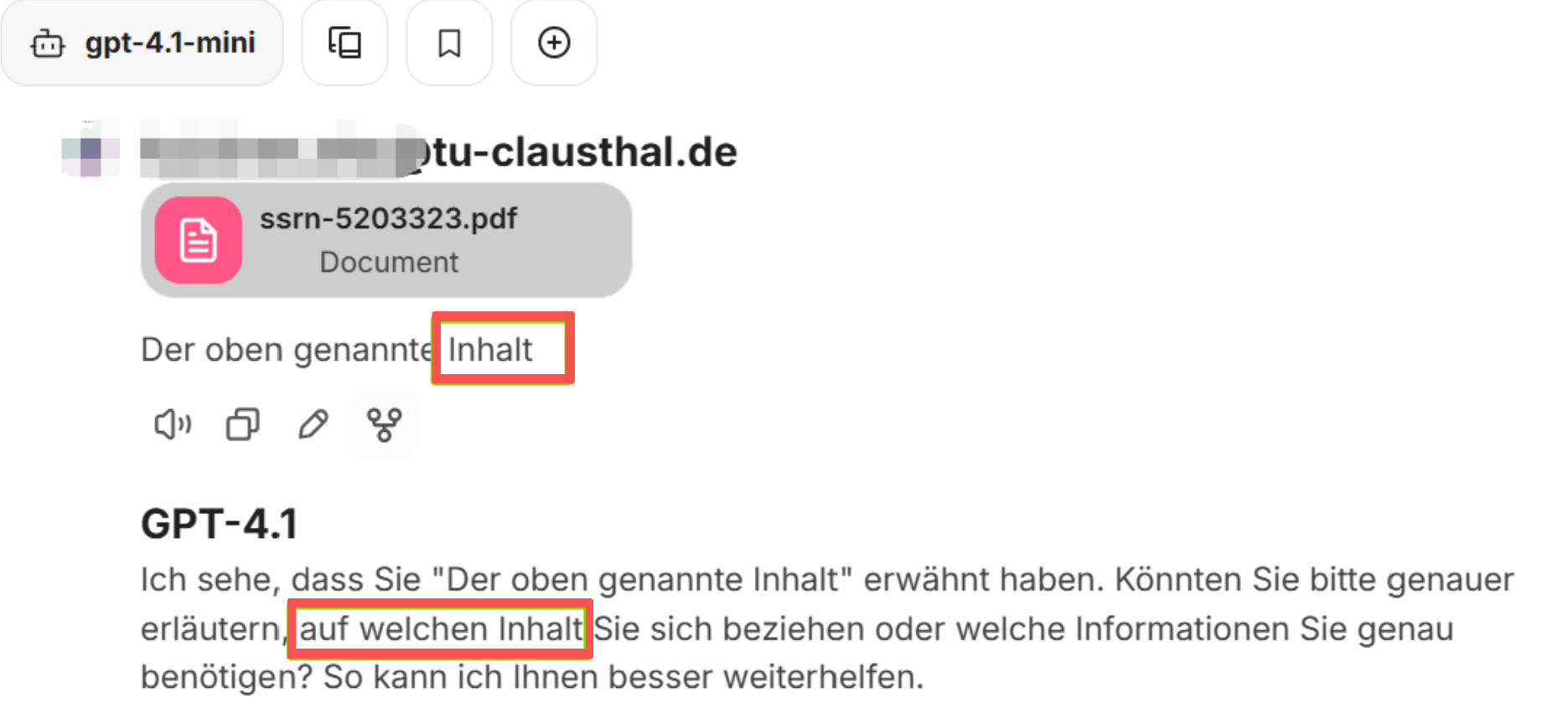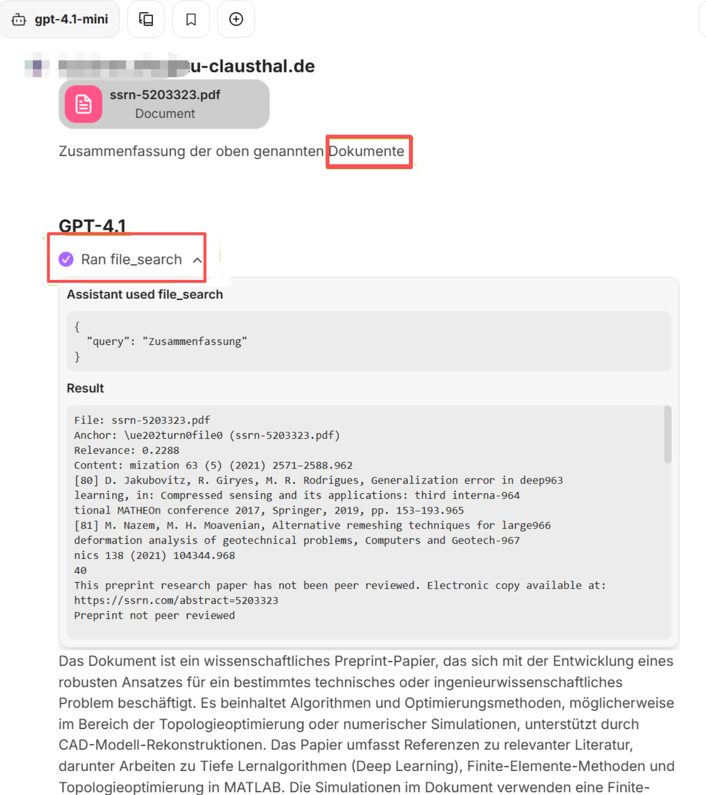 - Beim Hochladen als reiner Text verwendet das Sprachmodell keine zusätzlichen Werkzeuge, wie zum Beispiel das Tool „file search“.