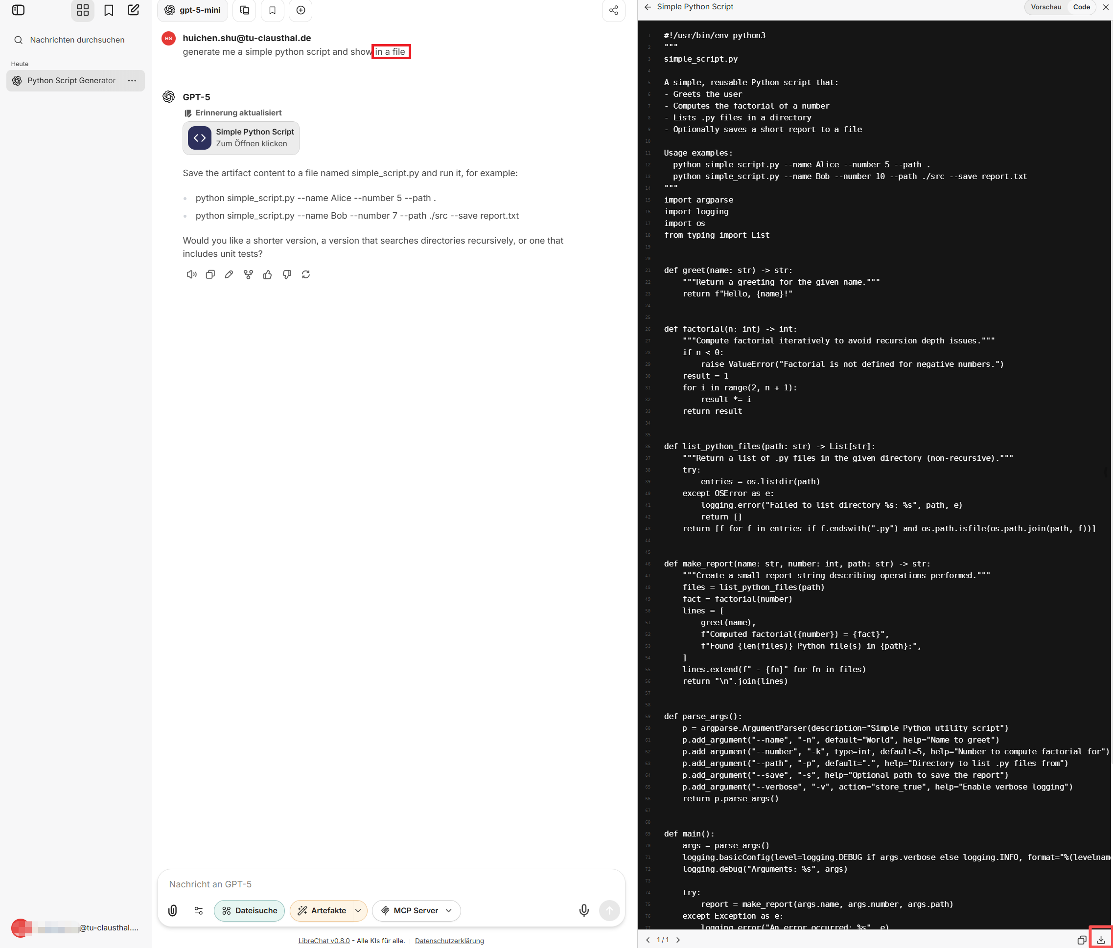 - Der große Screenshot zeigt einen typischen Anwendungsfall. Die Dateien, die über diese Schaltfläche heruntergeladen werden, weisen derzeit Formatierungsprobleme auf, die jedoch in Zukunft behoben werden. Vorläufig werden Standarddateien weiterhin als „index.html“ gespeichert. Daher ist eine manuelle Umbenennung der Datei weiterhin erforderlich, bsp. als demo.py.