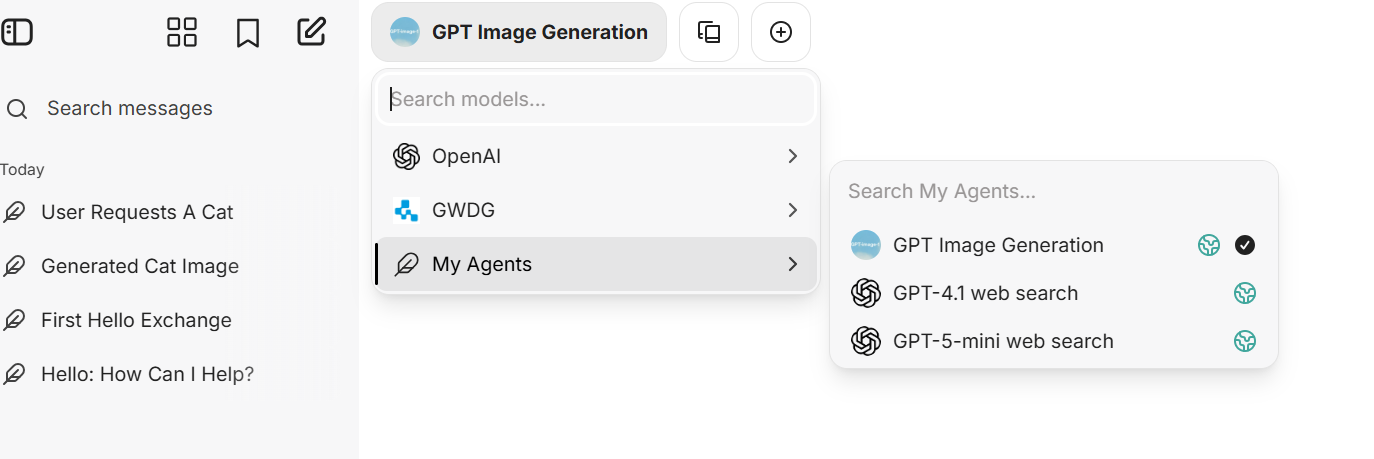 Das Bild zeigt einen Ausschnitt aus der Dateiupload- und Funktionsleiste in LibreChat. Zunächst sieht man die Schaltfläche „Dateisuche“ (Nummer 1). Erst wenn man auf diese Schaltfläche klickt, öffnet sich das oben angezeigte Auswahlmenü (Nummer 2), in dem verschiedene Optionen für den Datei-Upload erscheinen. Dazu gehören „Bild hochladen“, „Hochladen als Text mit OCR“ und „Hochladen für Dateisuche“.
