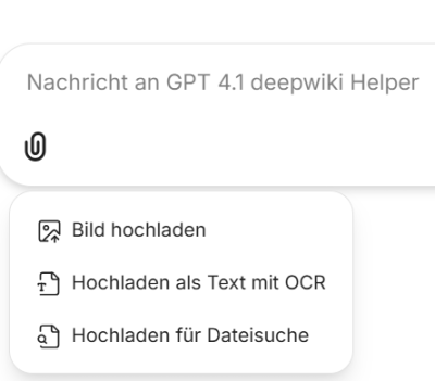 : Das Büroklammer-Symbol ermöglicht es Ihnen, Dateien an Ihre Nachrichten anzuhängen. Die drei Optionen in LibreChat unterscheiden sich folgendermaßen: Mit „Bild hochladen“ lädt man Bilder zur Analyse hoch; „Hochladen als Text mit OCR“ extrahiert per Texterkennung den sichtbaren Text aus Bildern oder PDFs und verwendet ihn direkt als lesbaren Inhalt; „Hochladen für Dateisuche“ hingegen speichert und indexiert Dateien, um später gezielte Suchanfragen im Dokument zu ermöglichen. Besonders wichtig ist der Unterschied zwischen den beiden Upload-Arten – die eine wandelt Dateien sofort in Text um, die andere macht sie durchsuchbar für komplexe Abfragen.