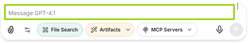 : Diese Schaltfläche ist in diesem speziellen Proxy nicht verfügbar. Dieses Dropdown-Menü zeigt verschiedene Einstellungen und Funktionen an, die man in LibreChat nutzen kann. Dateisuche ermöglicht die Suche in hochgeladenen Dateien. Erst wenn Sie diese Schaltfläche aktiviert haben, erscheint die Option „Büroklammer-Symbol“ im bisherigen Büroklammer-Symbol; Artefakte in LibreChat sind automatisch generierte Dateien oder Inhalte, die zusätzliche Informationen oder Ergebnisse im Chat bereitstellen. Die im Menü gezeigten Optionen ermöglichen es, spezielle Anweisungen für shadcn/ui-Komponenten einzuschließen oder benutzerdefinierte Prompts zu verwenden, um die Erstellung und Darstellung dieser Artefakte individuell anzupassen. Mehr Informationen finden Sie hier Empfohlener Ablauf zur Nutzung. ; MCP Server bietet den Zugriff auf externe Dienste wie Web-Crawler oder Wissensdatenbanken. Der Deepwiki MCP-Server crawlt Deepwiki-Inhalte und konvertiert sie in Markdown, sodass externe Dokumentationen direkt in das Chatfenster integriert und mithilfe eines Sprachmodell-Agenten gezielt abgefragt werden können. Dies ermöglicht einen schnellen und bequemen Zugriff auf fundiertes Wissen, ohne den Browser wechseln zu müssen. Der Budgetstatus für alle Komponenten kann individuelle Präferenzeinstellungen beibehalten.